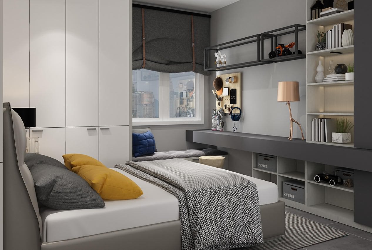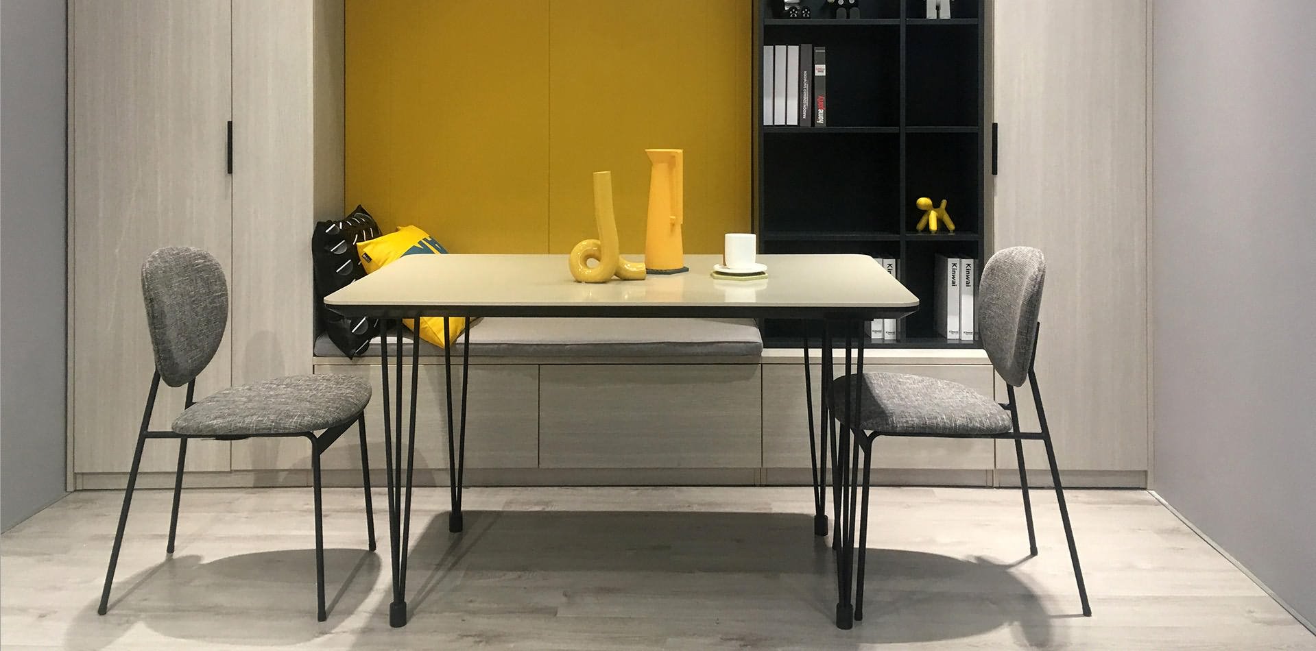 宛如俄罗斯方块的收纳背景墙,有趣好玩又实用。金属铁艺的点缀增添硬朗与精致的气息。